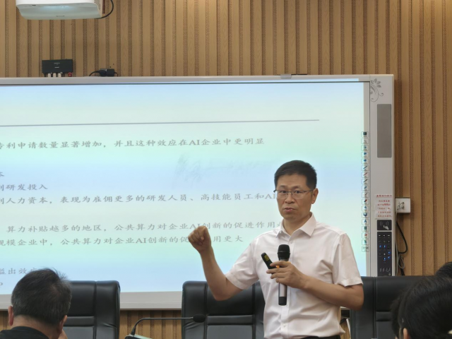 In the lecture, Yu Minggui elaborated on the impact of public computing power on the AI innovation of small and medium-sized enterprises (SMEs). He pointed out that public computing power can significantly increase the number of AI patent applications of SMEs, and this effect is more pronounced in AI-related enterprises. Yu further explained three key mechanisms of public computing power: reducing the cost of computing power usage for SMEs, encouraging enterprises to invest more funds in research and development, and motivating enterprises to allocate more capital to human capital. In addition, Yu discussed the heterogeneity of the impact of public computing power. He found that in regions with larger computing power scales and more computing power subsidies, the promoting effect of public computing power on enterprises' AI innovation is more significant; in terms of enterprise characteristics, public computing power has a stronger boosting effect on the AI innovation of private enterprises and small-scale enterprises. Through further analysis, Yu also discovered that public computing power can generate spillover effects of AI innovation and improve enterprises' total factor productivity (TFP). During the interactive session, teachers and students raised questions actively, and Yu Minggui answered their questions patiently. He emphasized that when writing academic papers, one should focus on important issues with practical and academic innovation, and encouraged teachers and students to conduct in-depth research on practical problems and persist in studying without giving up when encountering difficulties. Thus, this academic lecture concluded successfully. The discussion atmosphere during the lecture was extremely intense, which promoted academic exchanges between teachers and students. |