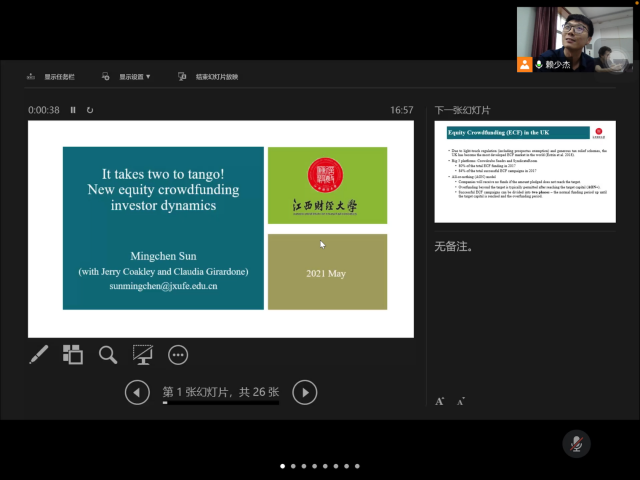On the afternoon of May 17, the School of Finance held the first phase of corporate finance Seminar in 2021 through an online conference. Professor Brain Lucey of Trinity College Dublin was invited to give a speech and serve as a guest reviewer of the paper. Dr. Mingchen Sun and Dr. Qing Wang shared their working papers. The meeting was hosted by Teacher Lai Shaojie from the School of Finance, and some teachers and graduate students from the School of Finance participated in the meeting.