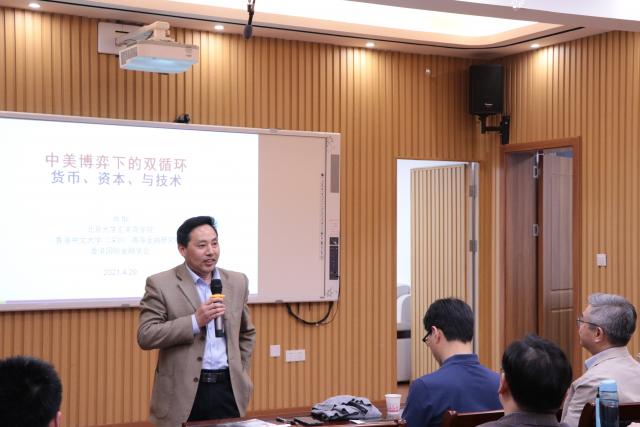 On the evening of April 29th, Professor Xiao Geng from the HSBC Business School of Peking University visited the School of Finance and gave a special academic lecture entitled The Dual Cycle under the Sino-US Game: Currency, Capital and Technology. The Dean of the School of Finance Gui Hefa presided over the lecture. Associate Deans of the School of Finance Xiao Jun and Liu Xinghua, as well as some college teachers, and graduate students of the School of 2019 and 2020 attended the lecture.