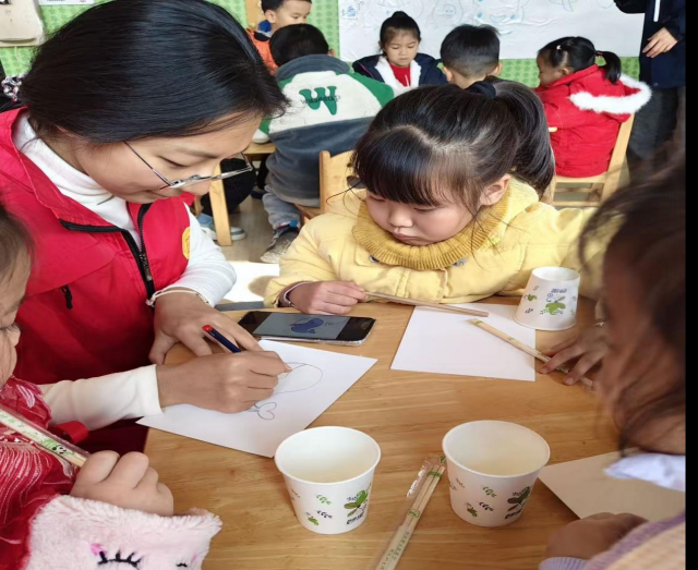 刚开始,孩子们面前摆放着废纸团、白乳胶和硬纸板等材料。志愿者们手把手演示揉捏技巧,鼓励孩子们大胆构思。渐渐地,教室里涌现出各式创意:有人用橙红纸浆堆叠出冰糖葫芦的立体质感,有人用绿色和棕色纸浆拼贴出树木剪影。
